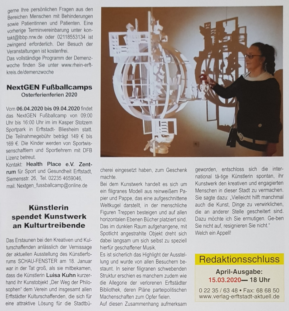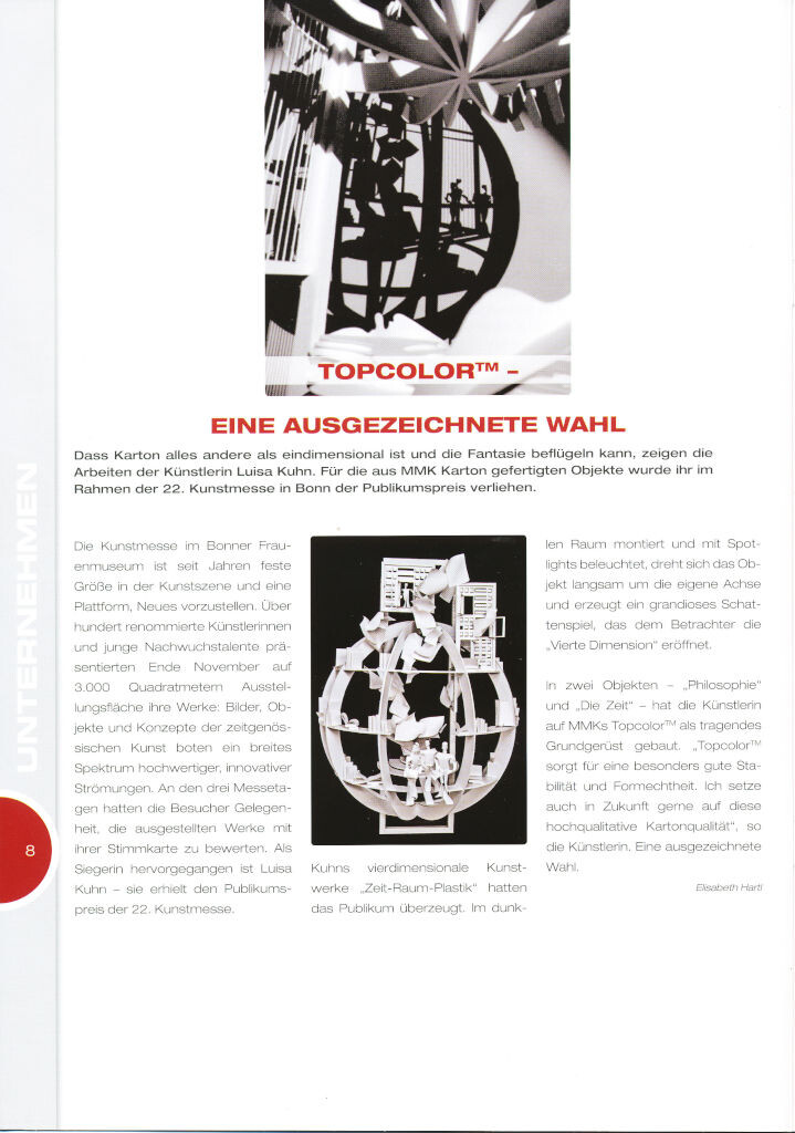 Die Kundenhalle der Commerzbank-Filiale Unter Sachsenhausen erstrahlt noch bis zum 5. Oktober in einem völlig neuen Glanz. Elf Preisträger und Nominierte des Förderpreises 2011 der LebensArt-Stiftung stellen dort mehr als 20 Skulpturen aus den unterschiedlichsten Materialien und Formen aus. Zu den Künstlern gehört auch die seit 16 Jahren in Köln lebende Russlanddeutsche Luisa Kuhn. Mit ihren dreidimensionalen Werken aus Papier, Pappe und Holz möchte sie die vierdimensionale Welt einfangen. Ihr Werk „Weg der Philosophen“ beispielsweise sei einer jungen Generation von Akademikern mit Herz für die Menschheit gewidmet. Die Künstlerin erklärt: „Jeder hat schließlich eine eigene Philosophie.“